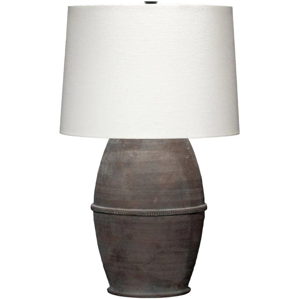 This large table lamp introduces an earthy tone and texture to a classic silhouette. The unique detail of a thin raised band draws attention to the body’s midline, and the dark grey ceramic of the lamp’s oversized body contrasts well with its clean white linen drum shade. This lamp is sure to make a substantial statement anywhere in your home, like an entry console or a dining room buffet.