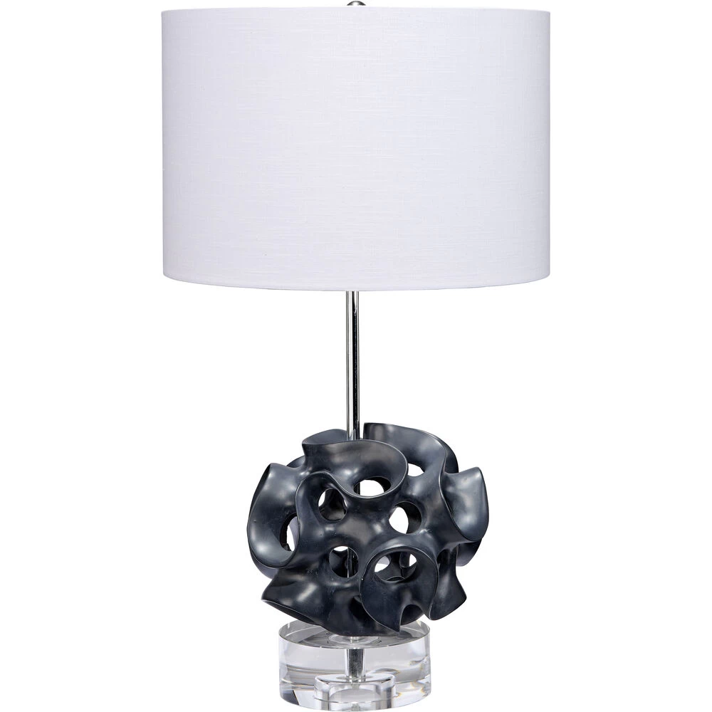 Ribbons of black resin swirl organically into seemingly random but perfectly balanced shapes in this unique table lamp. Inspired by the chunks of coral that can be found on the pristine white beaches of the Bahamas, our coastally influenced sculpture wraps around a simple metal rod body with a bright nickel finish. A substantial resin base anchors it all; a rolled edge linen drum shade and coordinating silver hardware add refinement.