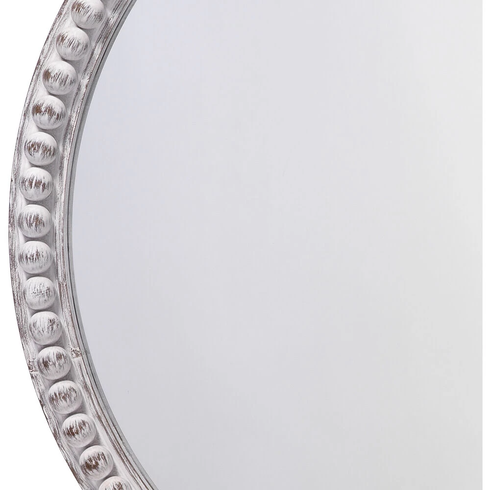 Our Audrey Mirror is classily simple with its delicate, round frame in a white washed wood finish. The slender frame has the additional detail of wood spheres around its perimeter. This light and airy mirror is the perfect addition to any guest room or bathroom. Hanging hardware: D-loops. Mirror surface: 26.5″dia. Mirror frame: 2″w. Material: MDF & solid wood beads