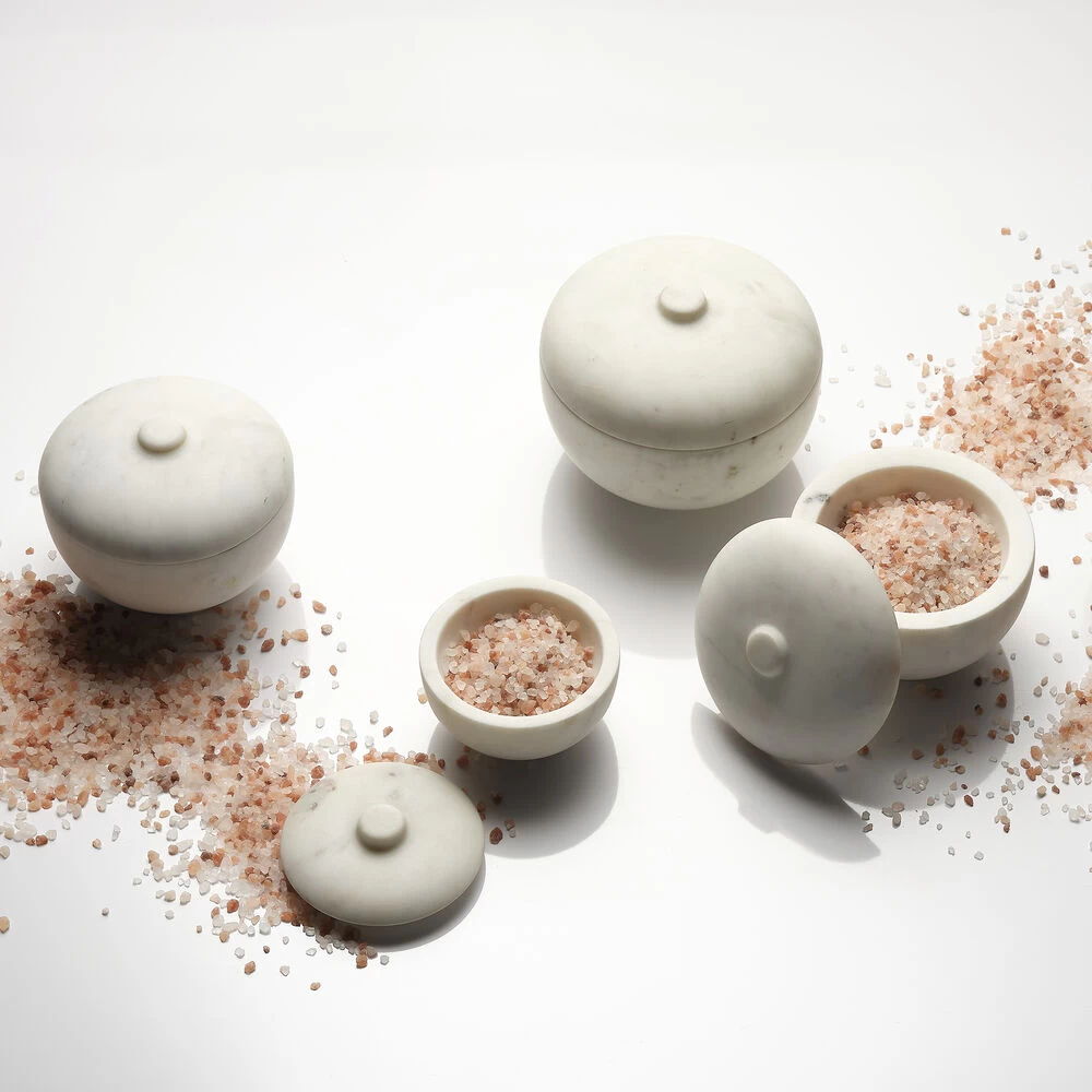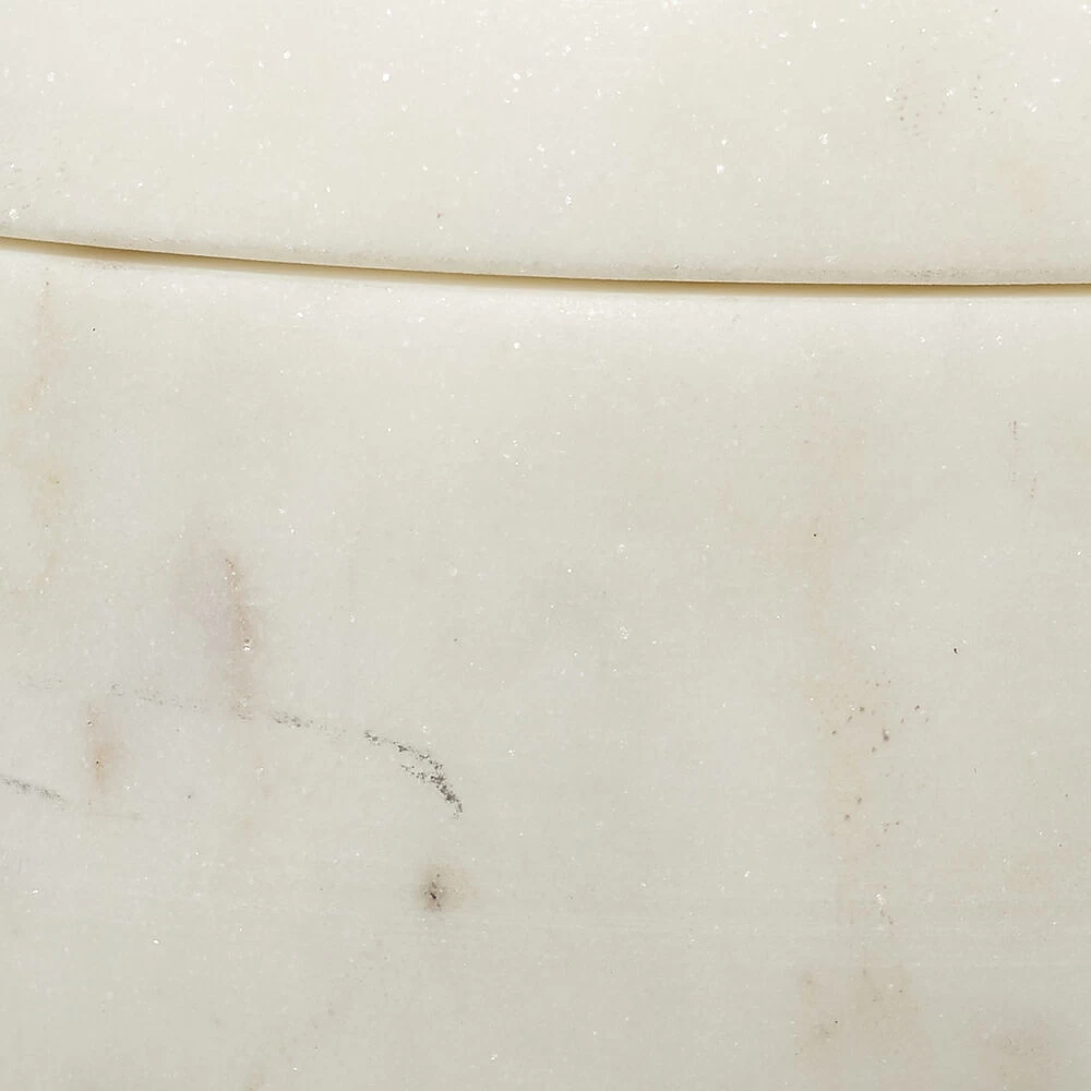 A softly rounded, lidded bowl is placed on top of a pillar base to create some seriously chic storage! These expertly crafted marble containers celebrate the beauty of the natural stone from which they are carved, and no two will be identical. Use with cotton balls in the bath, jewelry in your dressing area, or fill with potpourri to beautify and gently scent your entry.