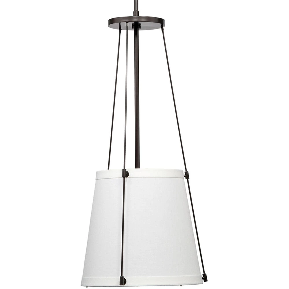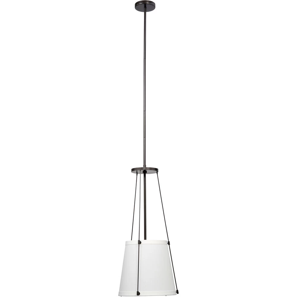 The pendant is suspended from a delicate metal framework with a modern metallic finish. Effortlessly appealing, it features an off-white drum shade in linen to softly diffuse its glow. Hang in a kitchen, over a dining table, or in an entry for an easy elegant was to light up your home.