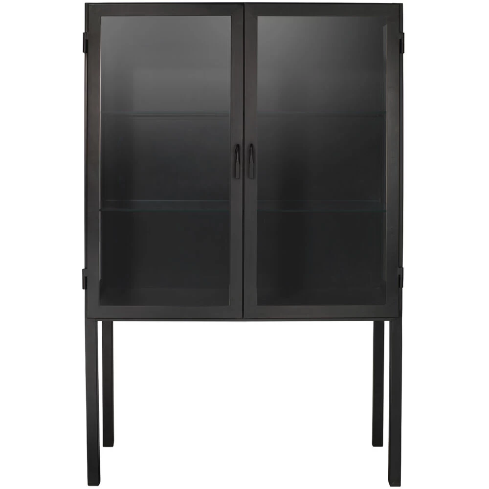 Glass panes are encased in simple black metal to create a wide, minimalistic cabinet perfect for storage or display. Use this piece to showcase your favorite barware or books.