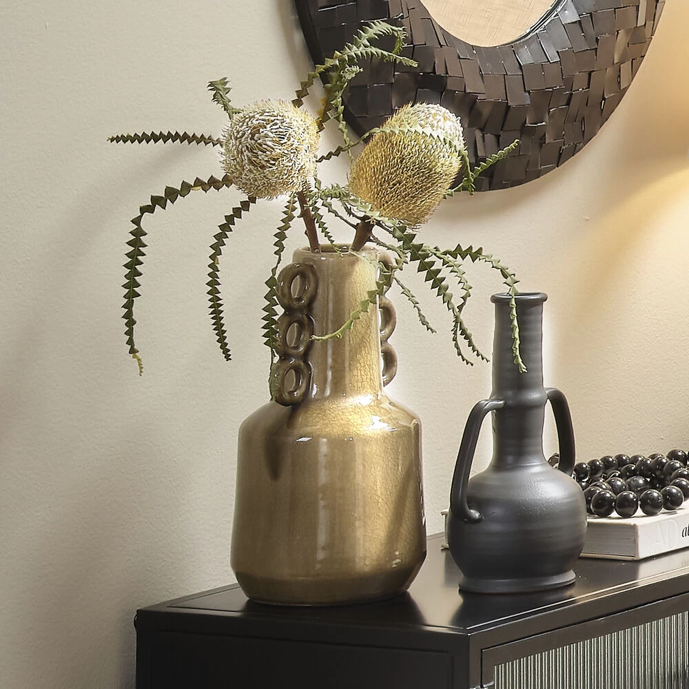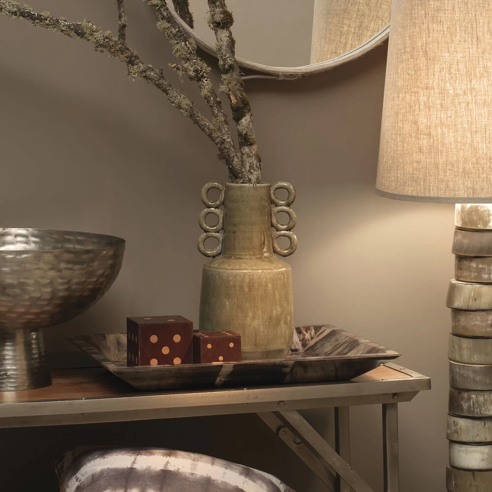 Add maximum style with minimum effor with these vases. Hand crafted of ceramic, its silhouette is adorned with three open handles on each side and finished with a reactive taupe glaze for a contemporary feel. Place on any table top and display your favorite florals.