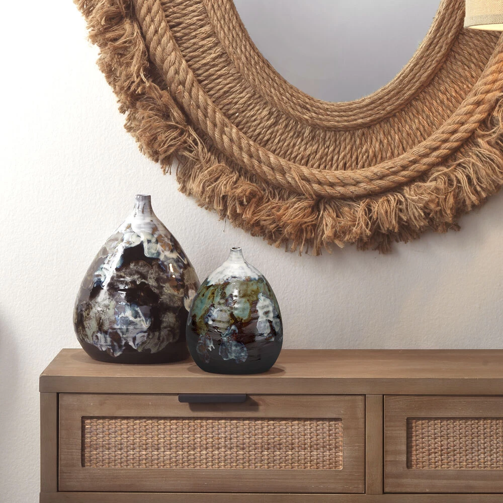 The stunning Collage collection features artisan crafted ceramic vases. They are available in an assortment of sizes and shapes, and each features thick, rich layers of hand applied glaze. The colors are organic and inspired by the earth. Every shade of sand, stone, sea, and sky can be found. True one-of-a-kind works of art, they are beautiful on their own or with your choice of dry filler, try feathers or reeds! Due to the handmade nature of this piece, variations in finish, pattern & shape will occur. No two will be alike.