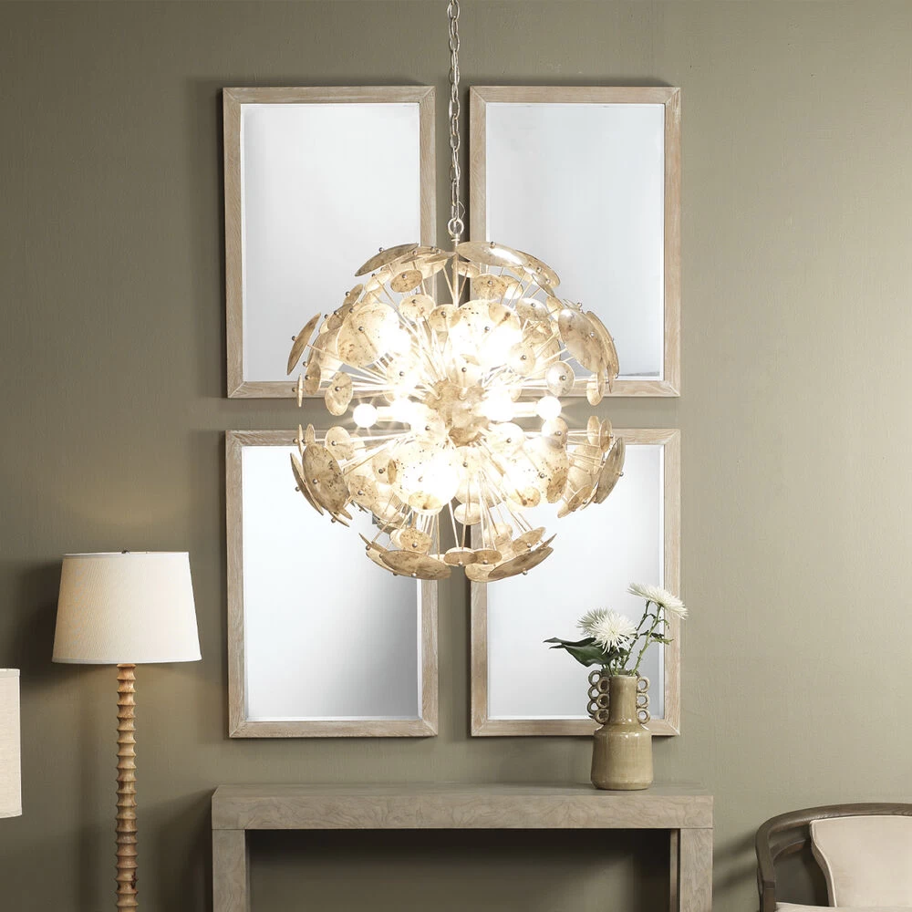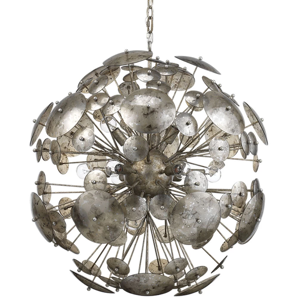 The Constellation Round Chandelier makes a bold modern statement with antiqued glass and champagne leaf metal. Inspired by the mid-century Sputnik chandelier, this hanging fixture provides beautiful ambient light glittering through layers of glass with speckled metallic patterns.