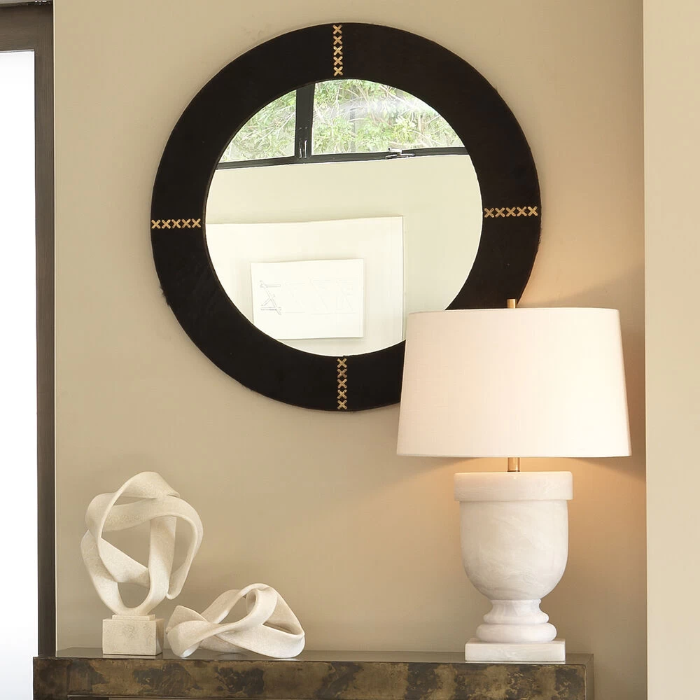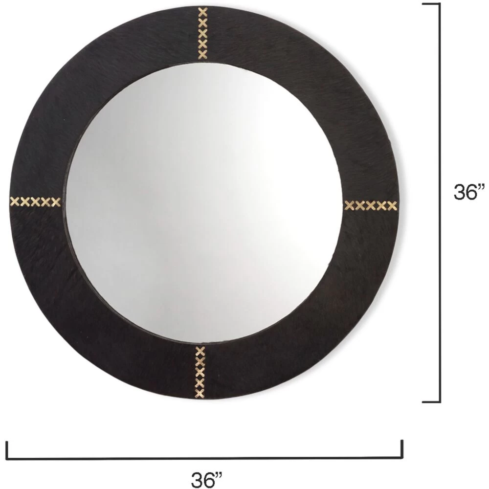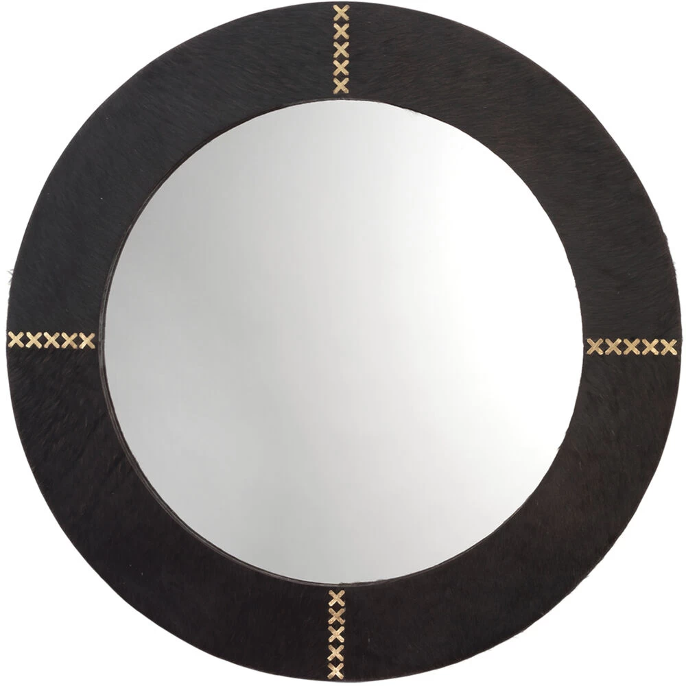 Espresso dyed hide is accented by antique brass ‘x’ rivets impressed into the hide. The stunning addition of warm antique brass to the elegant espresso hide creates a great accent for the wall.