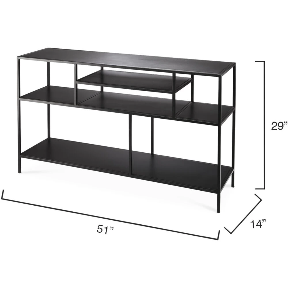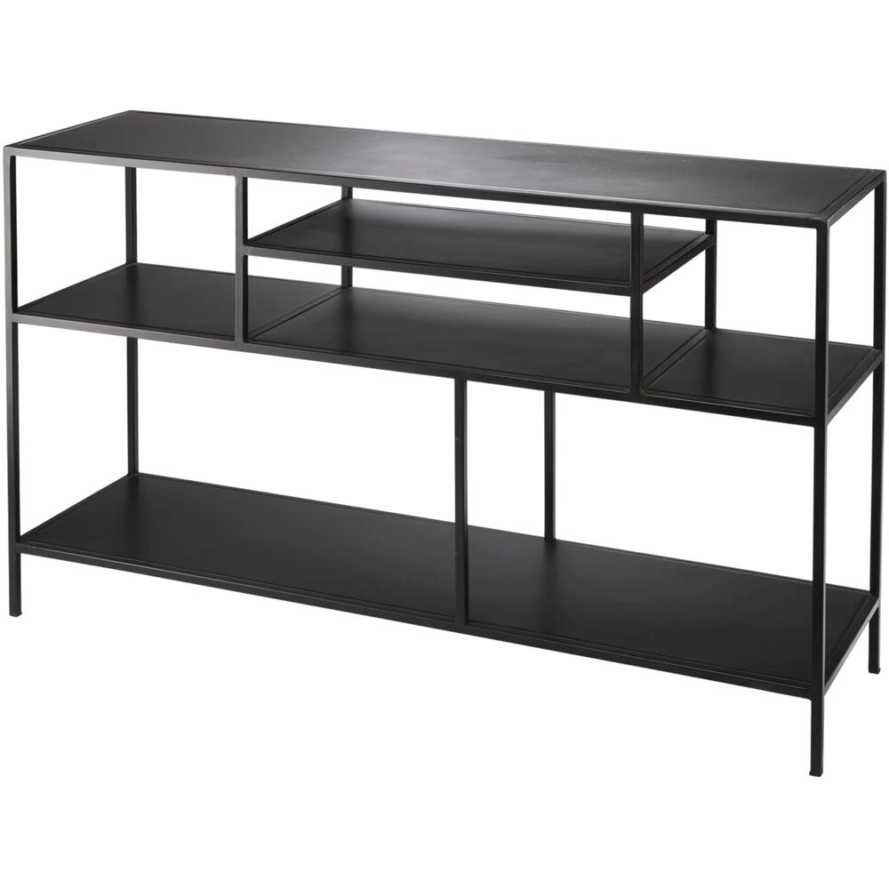 Black metal shelves and supports are asymmetrically arranged to create the perfect console or open-work media cabinet. The extra storage is great for displaying curated accessories or audio/visual necessities.