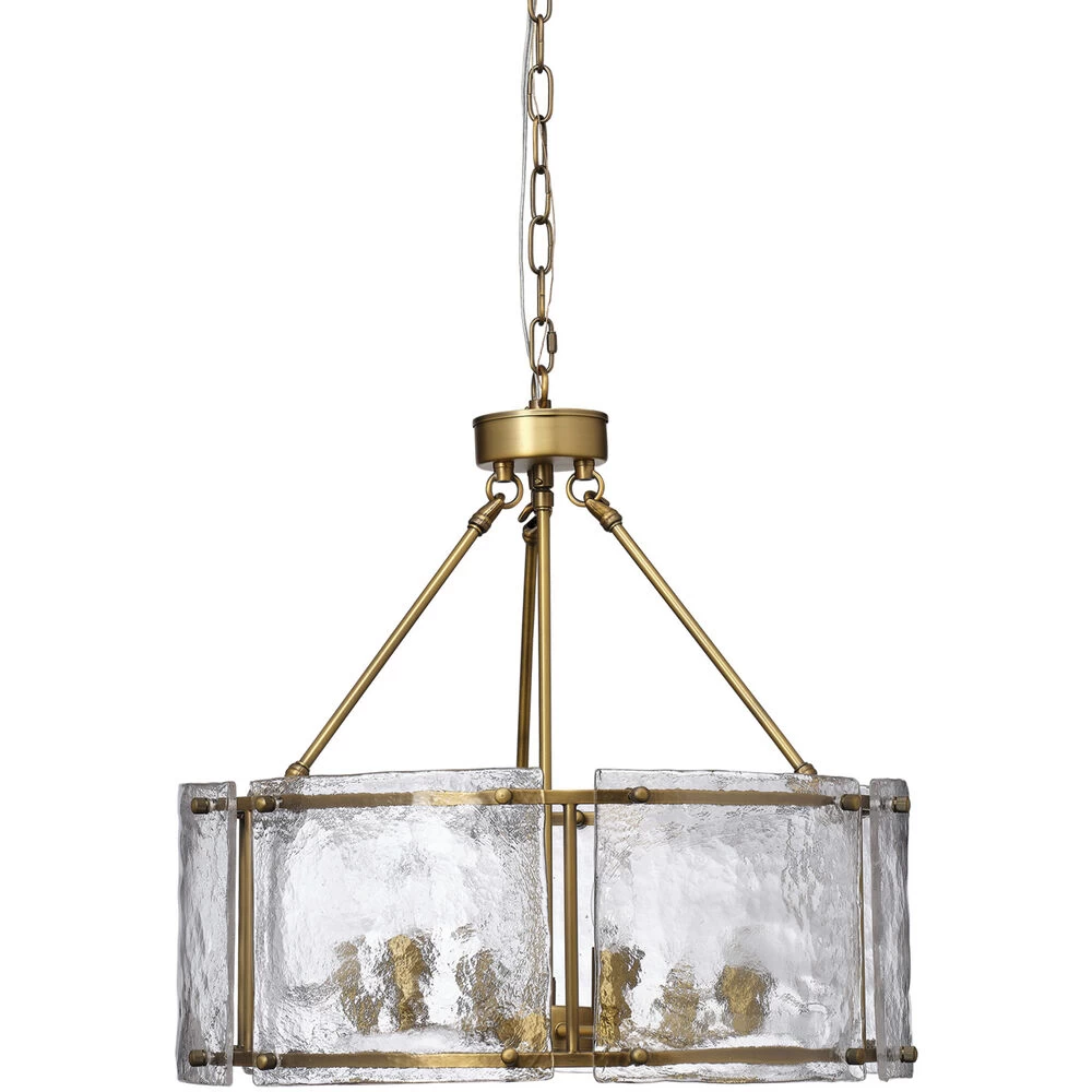 A refined study in contrasts, this striking chandelier features slabs ice-like glass that soften and diffuse the “flame” of the bulbs behind it. A burnished metal canopy and chain perfectly complement the richly textured glass. Sophisticated yet simple, it is a wonderful choice above a farmhouse dining table.