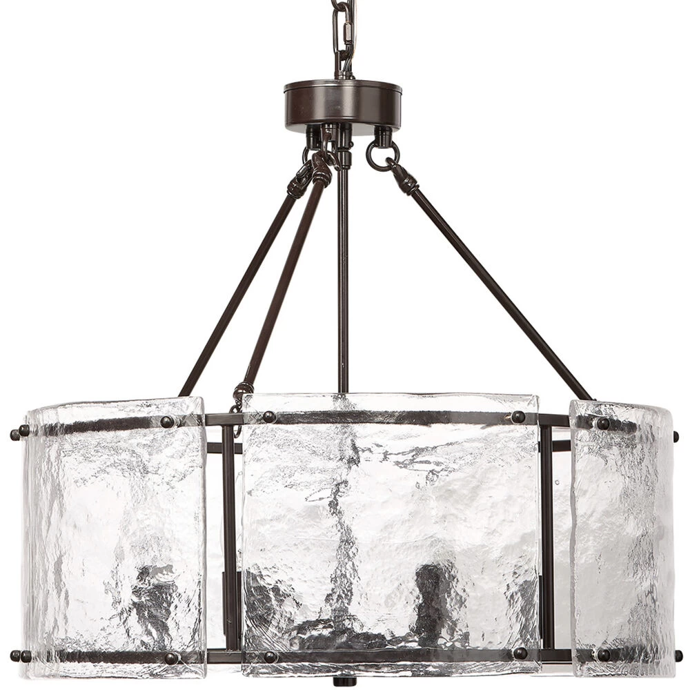 A refined study in contrasts, this striking chandelier features a softly curved slice of icelike glass that softens and diffuses the “flame” of the bulbs behind it. A smooth oil-rubbed bronze canopy and chain perfectly complement the richly textured glass. Sophisticated yet simple, this is a beautiful choice for a modern interior.