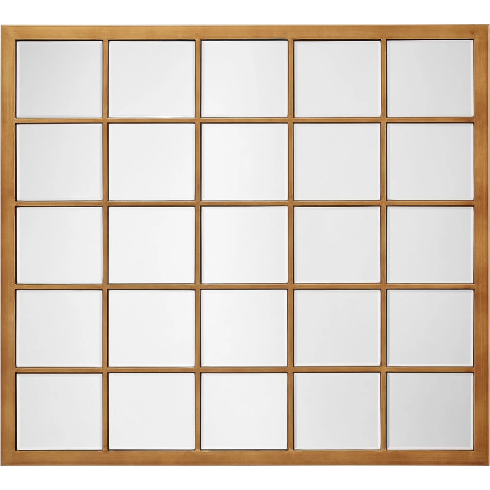 Whether you are looking to open-up a small space or spruce up an open wall, this mirror will make grand statement in any room. Inspired by a windowpane, this mirror features beveled glass surrounded by a slim metal frame hand-finished in antique brass for a classic touch.