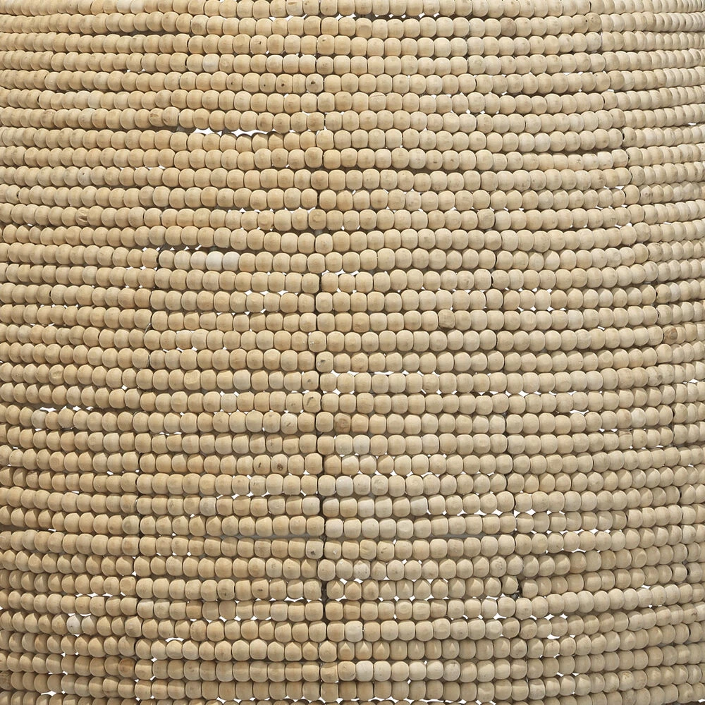 - Hand-carved wood beads in natural and off-white tones