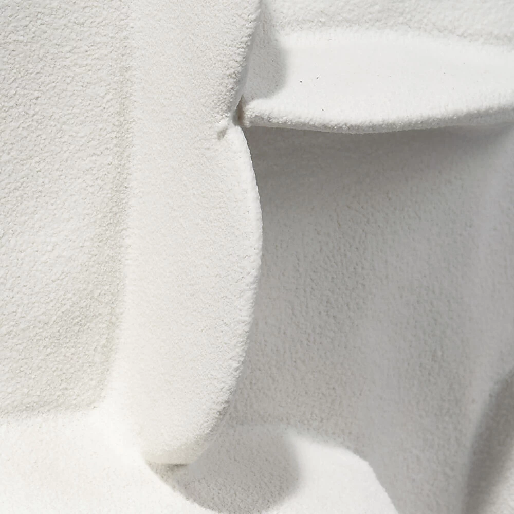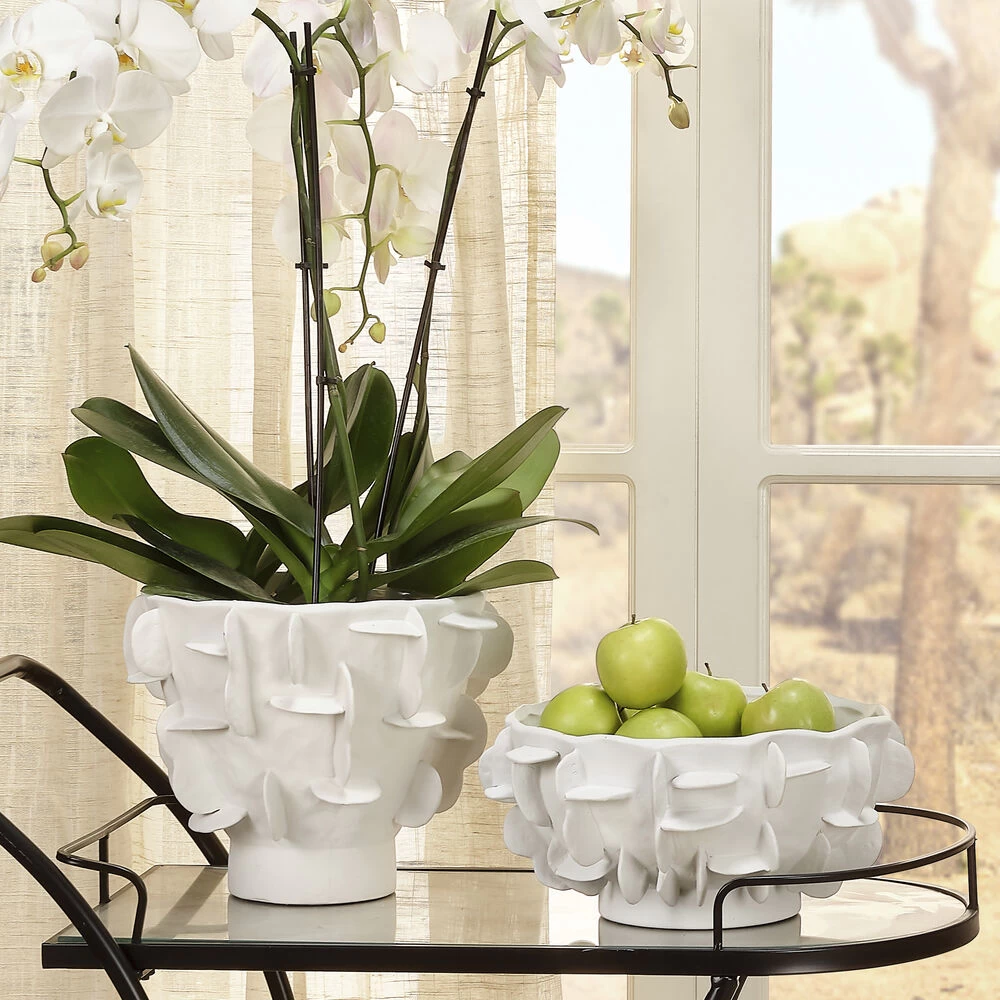 Beautifully handcrafted of white ceramic, this showstopper of a vase is a riot of rich texture. The surface of the bowl is emblazoned with dimensional, hand-formed ceramic paillettes. It is designed to draw the eye; a sophisticated, sculptural vessel that can be customized with your favorite filler or shown off as is.