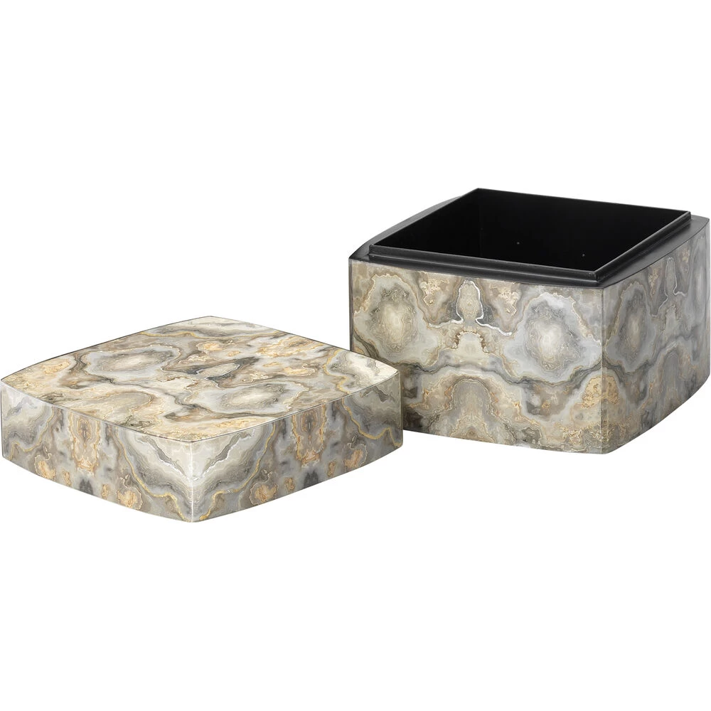 Inspired by Rorschach inkblots tests, known to examine emotion through interpretation, our Ink Blot box inspires you to look closer into the neutral tones of grey, taupe and cream, accented with silver and gold leaf. These components create dynamic patterns through overlaid photos underneath a clear lacquer.
