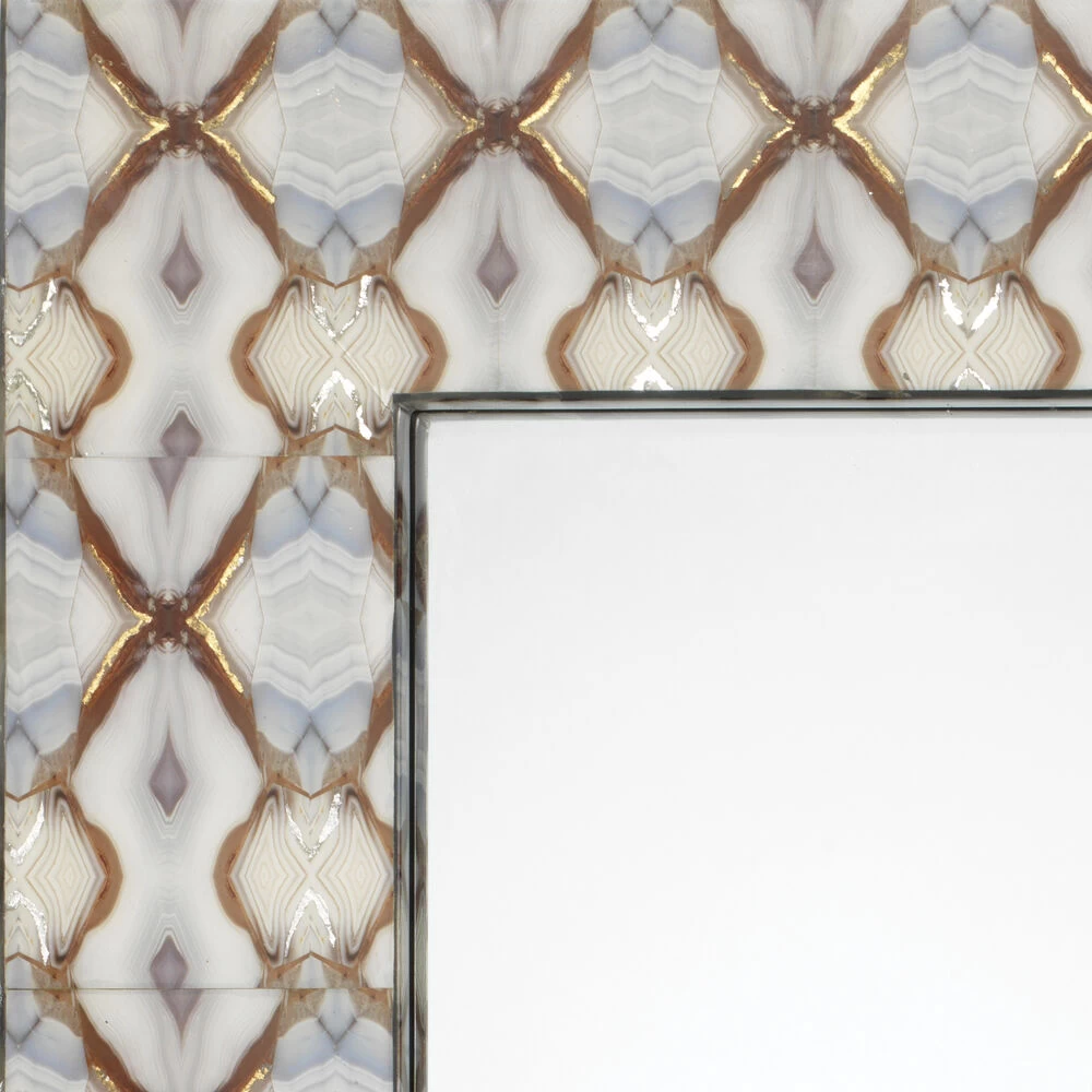 The design on the frame of this alluring mirror is taken from photos of agate repeated in a way that gives the impression of looking through a kaleidoscope. The hand applied gold leafing adds another layer to create this incredible finish.