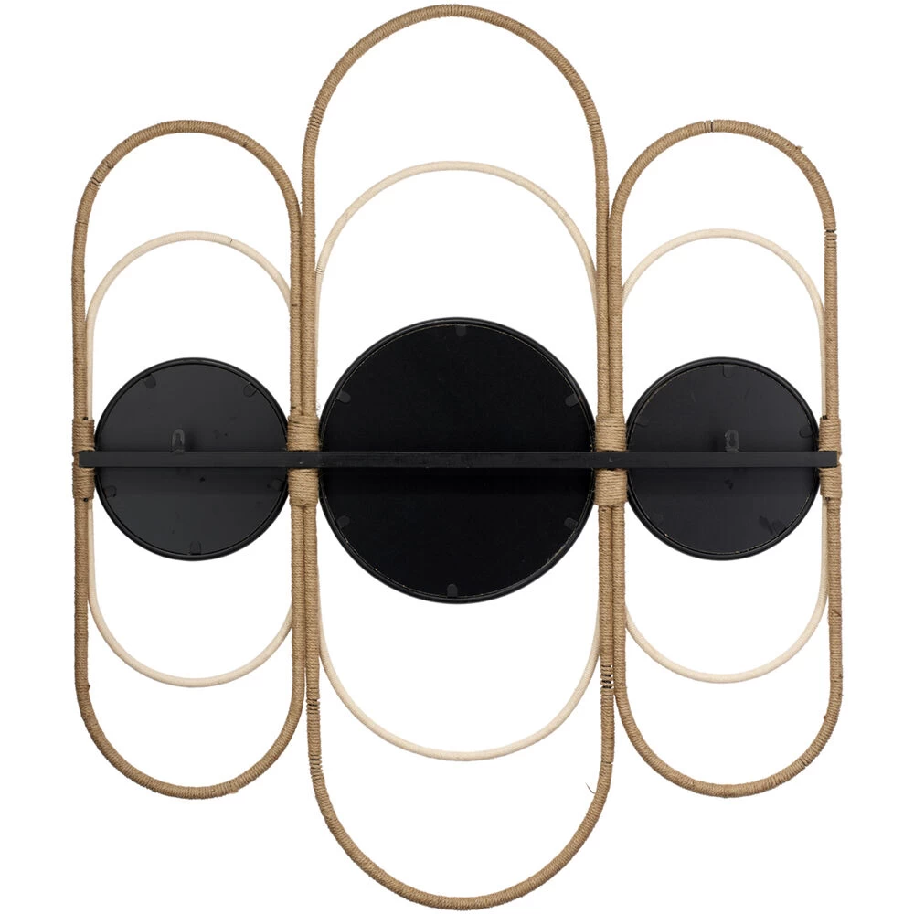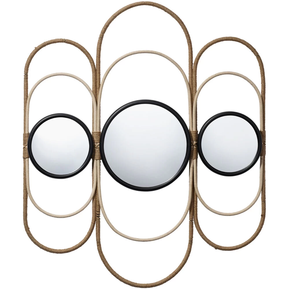 Three black-framed round mirrors are accented by oblong oval shapes wrapped in natural and light-colored jute rope to create this contemporary mirrored art piece. The bold layers, shapes, and textures are truly hypnotizing, pairing both natural and industrial elements. Create a focal point in your home with this eye-catching decorative mirror.