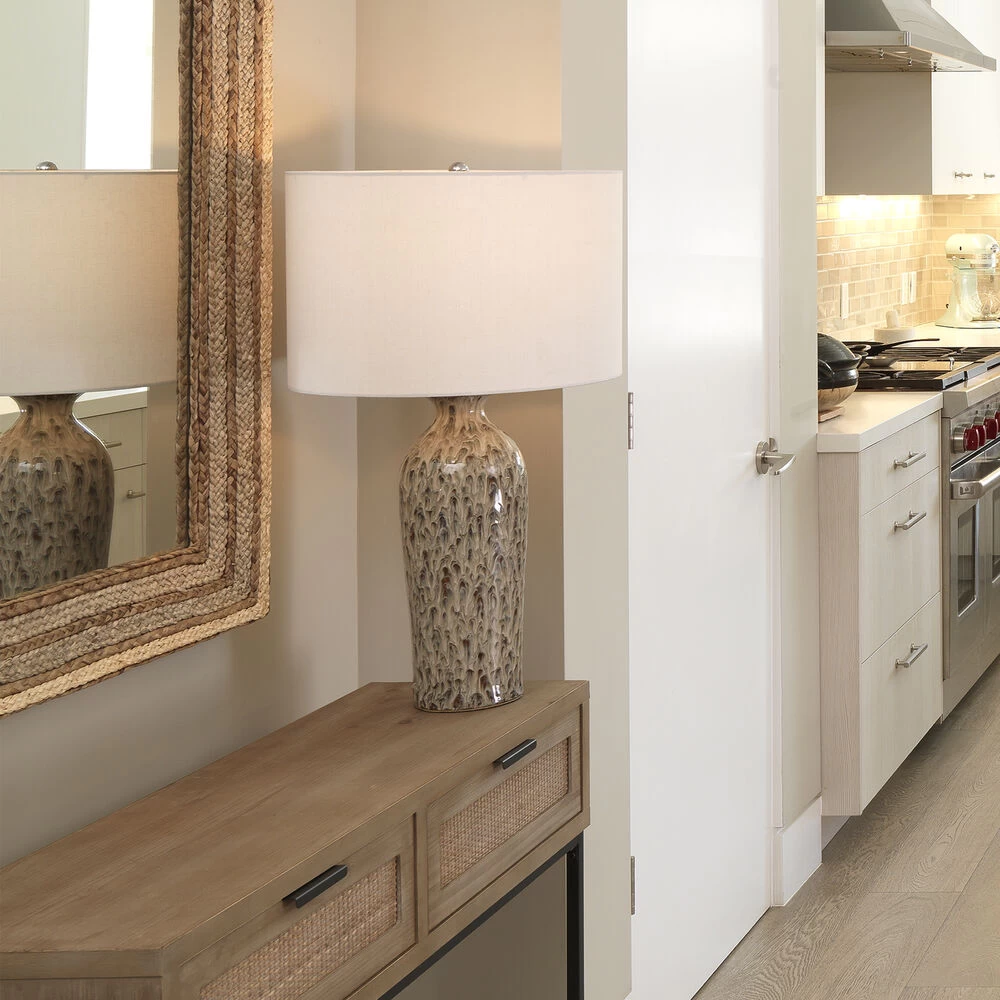 The bold glaze takes center stage in the Nomad Table Lamp! Neutral creams and browns wrap around this stunning ceramic table lamp and finial to maximize style. The lamp base’s cream tones are matched with an off-white linen lamp shade to create the perfect pairing.