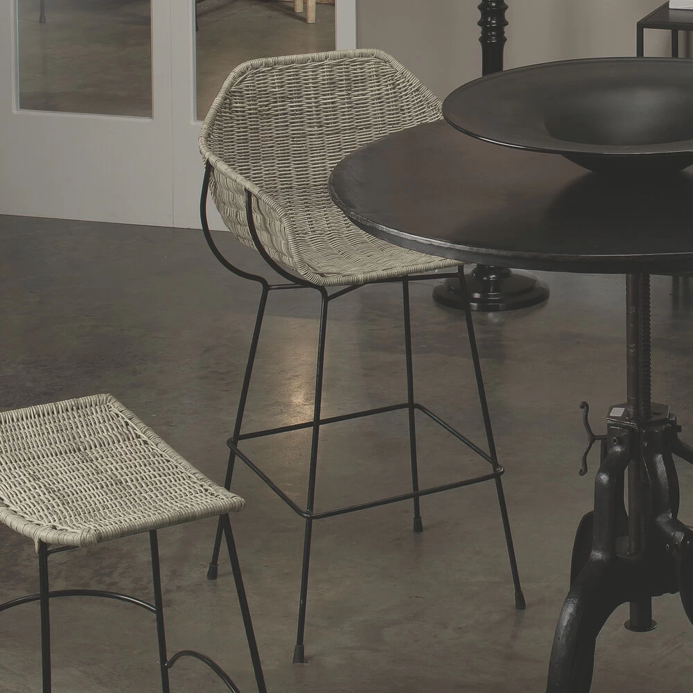 This molded bar stool comfortably wraps you in woven rattan, placed on refined black metal legs makes the perfect easy stool for any coastal or bohemian space.