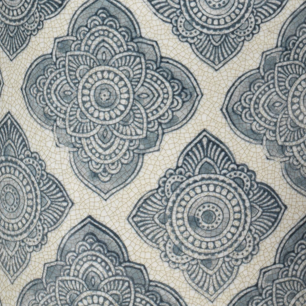 This cannister is a simple contemporary column shape in a sophisticated Arabic indigo pattern, repeated over a bone white porcelain background.