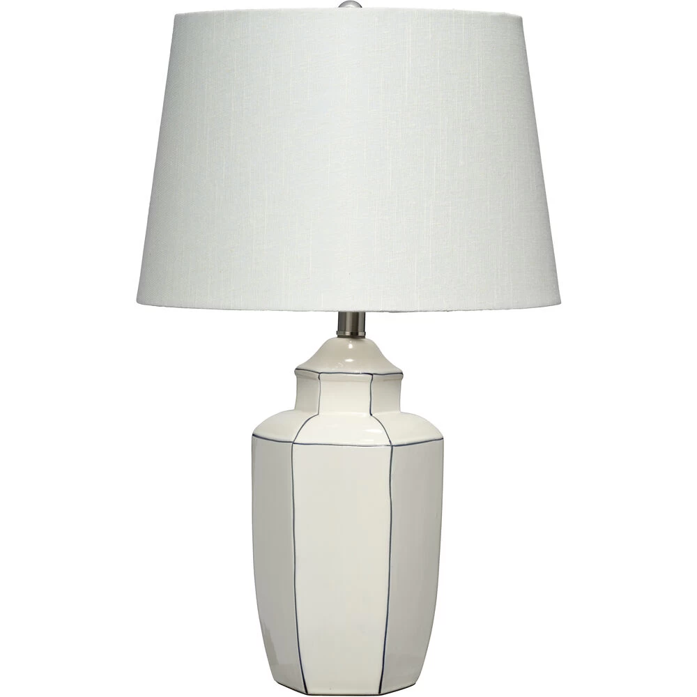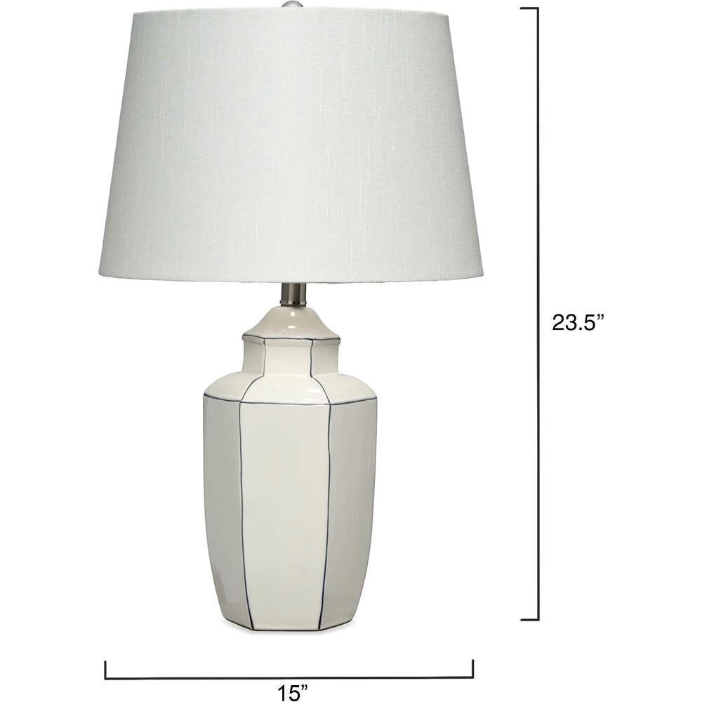 This handcrafted ceramic lamp accentuates its lines with hand-painted piping. The white-on-white look continues with a rolled edge linen shade, and lends itself well to coastally inspired interiors, or to decors that just need to lighten up a little!