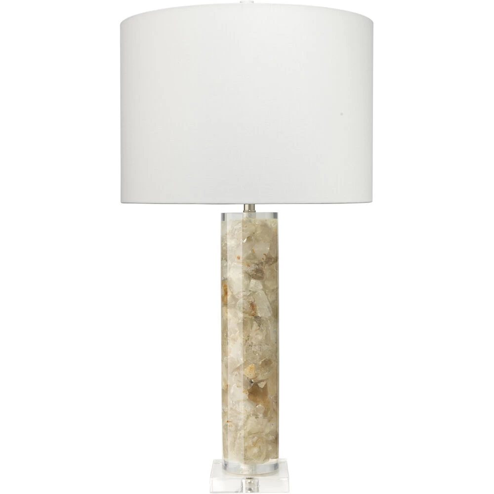 A slim cylinder of natural calcite forms the base of the Peyton lamp. The beauty of the natural stone is allowed to shine here and the rest of the lamp is kept simple with a square acrylic base, a white linen drum shade, and a cylindrical crystal finial. No two pieces of calcite, and no two lamps, will be identical. Made of natural Calcite stone. Each stone is unique, colors will vary and no two will be identical.