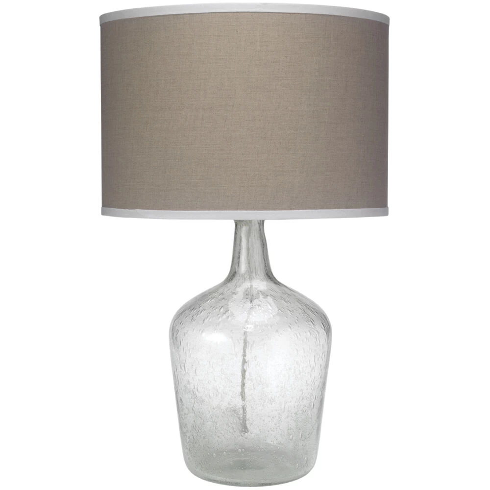 Seeded glass is a hand-blown rough glass where the texture of the glass is the most important design element. This rough and bubbled, hand-made glass table lamp is rustic, yet sophisticated in the way it shines and glistens when light hits its surface. Its burlap drum shade adds additional style and texture.