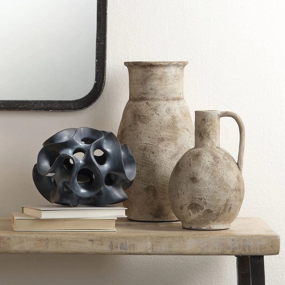 The silhouette of this decorative vase is traditional, but the handcrafted details give the vase a personality of its own. The hazelnut ceramic is shaped by hand and given a weathered surface effect to create an antique texture and form. Its unrefined shape and earthy color palette will bring a warmth to your existing decor. Each vase is a one-of-a-kind piece of art. As such, their exact shape, color, and finish will vary slightly.