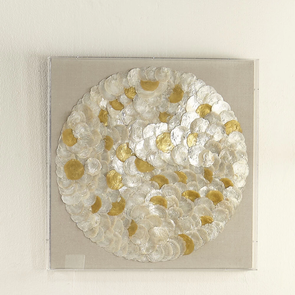 A well-rounded theme abounds in this wall art, from the white and gold capiz shell discs to the circle shape they create when carefully layered together. The artisan crafted piece is displayed on linen with a clear acrylic shadowbox, designed as the perfect accent to your home’s contemporary or coastal decor. Carefully arranged by hand with natural materials, each piece is a unique work of art.