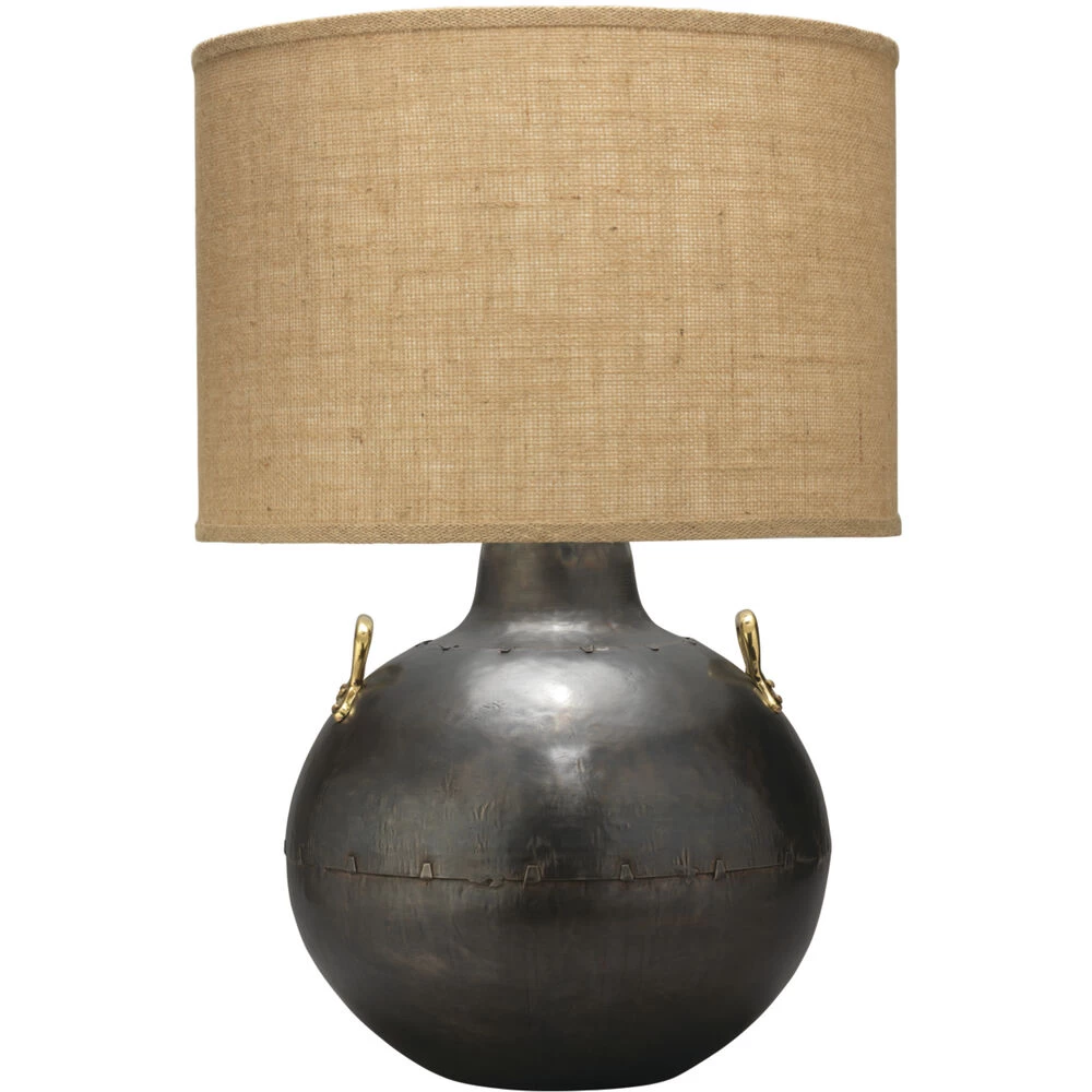 Add a little edge to your Decor with this metal table lamp. The iron finished base is styled after a two-handed kettle and topped with a natural burlap shade for a warm, handsome look.