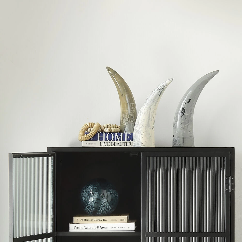 A dramatic reinterpretation of natural horn décor, our trio of sculptural accents is formed of swirled resin in cream, black, and gray. Each piece is one of a kind, as no two sets of patterns created using this technique are ever identical. Display on a bookshelf, console, or coffee table for the vertical accent that your décor is missing.