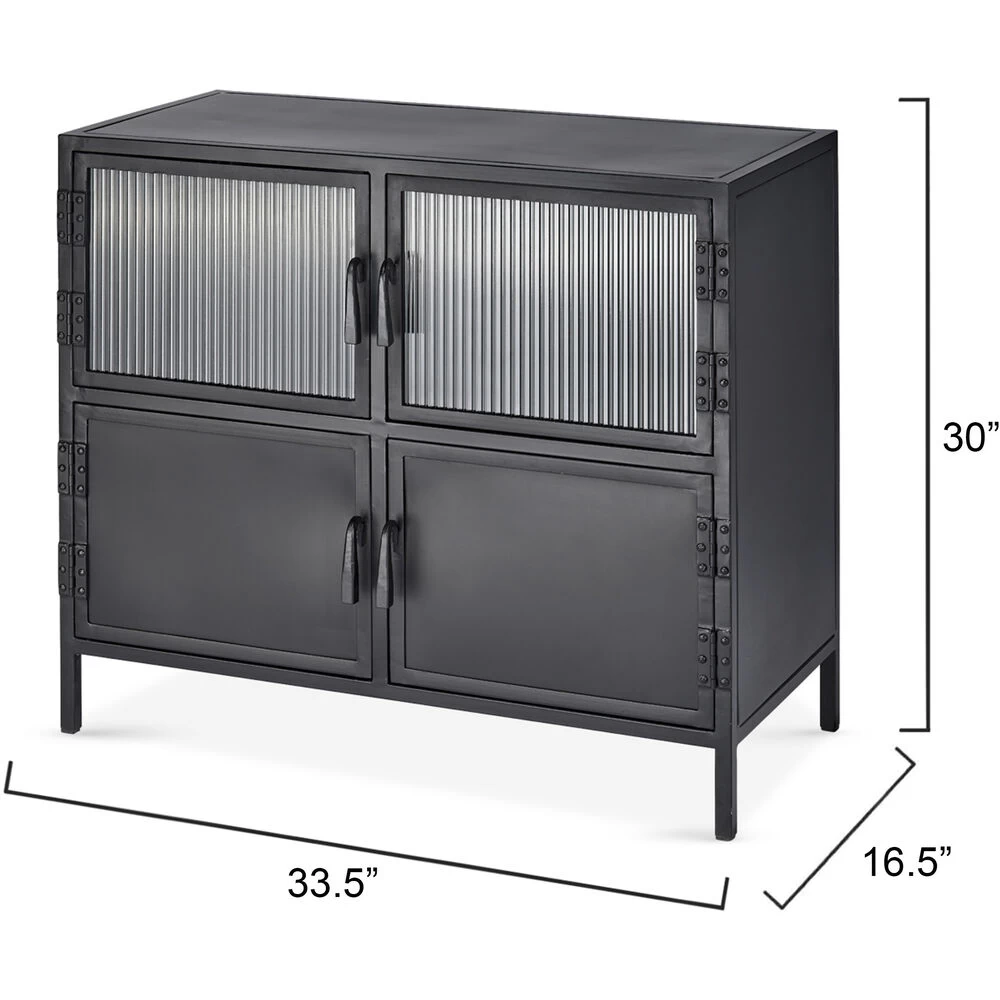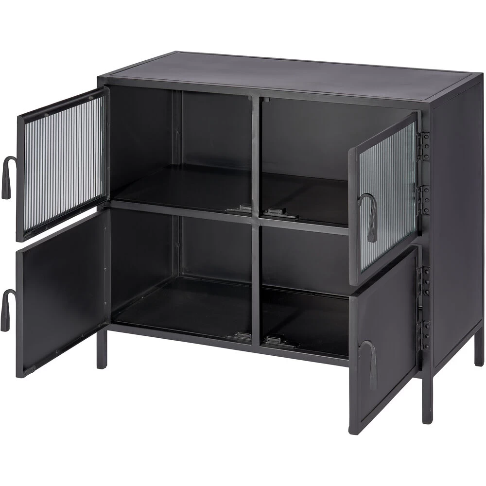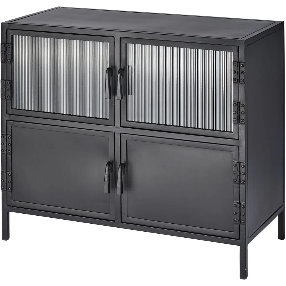 With an abundance of storage and tons of style, this industrial edged side table is ideal for an urban, contemporary décor. Handcrafted of minimally finished black metal, its four doors open to reveal ample cupboard space and one fixed shelf. Two of the doors are in a richly textural ribbed glass. The bottom two are solid metal. All six open easily with hand-forged iron pulls.