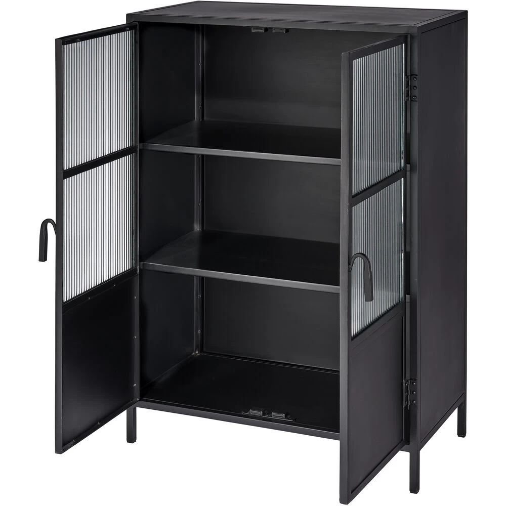 With an abundance of storage and tons of style, this industrial edged dresser is ideal for an urban, contemporary décor. Handcrafted of minimally finished black metal, its two large doors open to reveal ample cupboard space and two fixed shelfs. The simplicity of the design is elevated by panels of richly textural ribbed glass and hand-forged iron pulls.