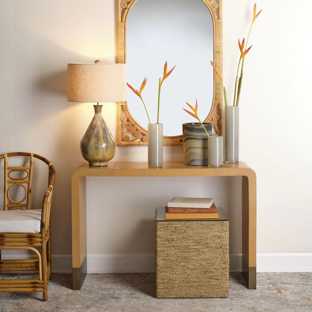 Sleek and easy lines are masterfully manipulated to create a modern console table. Inspired by one of nature’s most breathtaking sites, naturally cascading water, this console table features warm leather and cool metal finish ends. The surface on this table is ideal for displaying everything from books to a pair of stylish lamps. Plus, there’s enough space underneath to tuck away baskets or tuck away extra accent stools. The look is clean and contemporary, and the craftmanship is unrivalled.